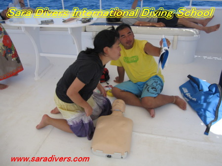 EFRコースはダイビングに限らず、生活の中で起こりうる事故や病気怪我などの緊急事態に対応する知識と技術を習得します。マネキンを使って心配蘇生法(CPR)の練習もします。